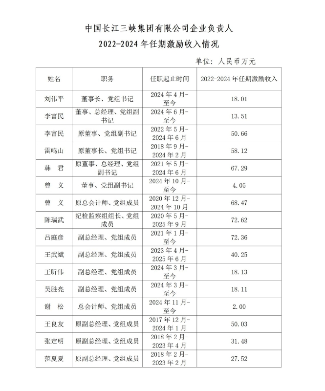 中國長江三峽集團有限公司企業(yè)負責人2022-2024年任期激勵收入情況