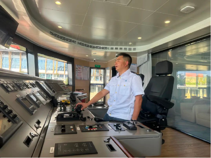 ▲?曾擔(dān)任過(guò)總船長(zhǎng)的湖北三峽旅游集團(tuán)葉勇在船舶駕駛室。攝影:黃欣