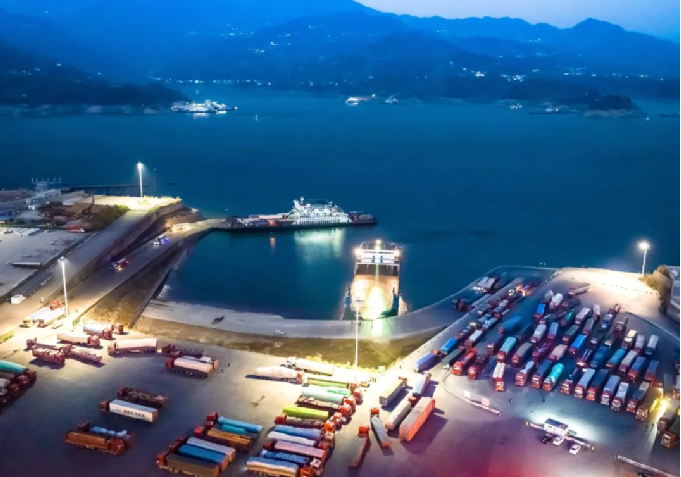 ▲?貨車在三峽大壩上游湖北省宜昌市秭歸縣銀杏沱滾裝碼頭上、下船。滾裝運(yùn)輸方式既能節(jié)省時(shí)間,又能降低成本,每天進(jìn)出銀杏沱滾裝碼頭的貨車近千輛。攝影:新華社 鄭家裕