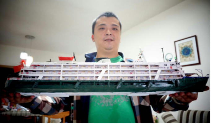 ▲?長(zhǎng)江船舶愛(ài)好者王軒和他制作的“江渝4”號(hào)客輪模型。此船換色改名后,現(xiàn)收藏于奉節(jié)縣詩(shī)城博物館