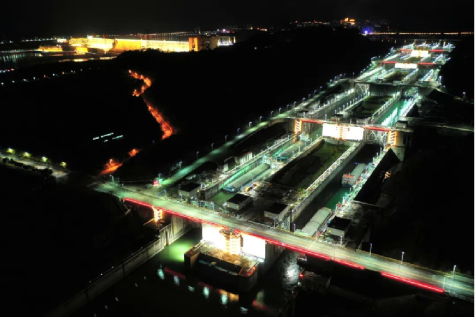▲?三峽雙線五級(jí)船閘夜景? 攝影:湯偉