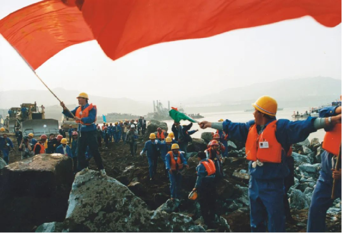 ▲1997年11月8日大江截流成功,工人在合龍的圍堰上揮舞旗幟慶祝。攝影:孫榮剛